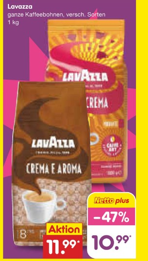 Im Vergleich zum üblichen Marktpreis von etwa 20,49 € bietet Netto-online die Lavazza Bohnen für nur 10,99 €, was einer deutlichen Ersparnis entspricht. Damit erhältst du ein Premium‑Produkt zu einem stark reduzierten Preis, ohne auf Qualität zu verzichten.
