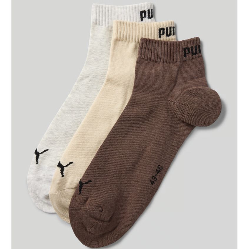 Du bekommst ein 3er‑Pack Puma Socken mit stylischem Label‑Print. Die Socken bestehen aus einem hochwertigen Baumwoll‑Mix mit einem leichten Stretch‑Anteil, der für einen bequemen, körpernahen Sitz sorgt. Der Schnitt ist klassisch und passt perfekt zu jedem Outfit – ob sportlich oder casual. Die Packung bietet dir drei verschiedene Farben, sodass du flexibel kombinieren kannst.